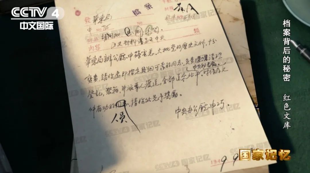 这是一封由毛泽东、刘少奇、周恩来、朱德共同批阅签发的电报,上面清晰地写着这样一段话:“大批党的历史文件,十分宝贵,请你处即指定几个可靠的同志,负责清理登记,装箱,并派专人护送,全部送来北平中央秘书处,对保存文件有功的人员,请你处先予奖励。”