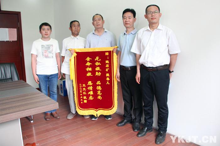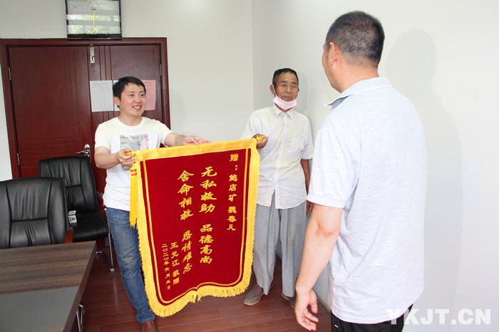 6月5日上午,来自邹城市王兰村的王元江和王同喜把一面写有“无私救助、品德高尚,舍命相助、恩情难忘”的锦旗和一封感谢信送到矿调度信息中心职工魏春凡手中,不停地握手表达着感谢。