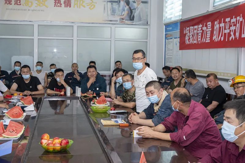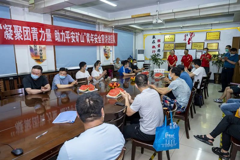 “牢固树立安全第一的思想,不安全不作业。”主持人随机点名。被点到的职工要说出自己心里的安全话,把安全祝福送给每一位工友,营造了浓厚的安全氛围。矿团委还为干部职工们准备了清热解暑的西瓜和油桃,叮嘱他们注意防暑、保护身体,确保安全度夏。