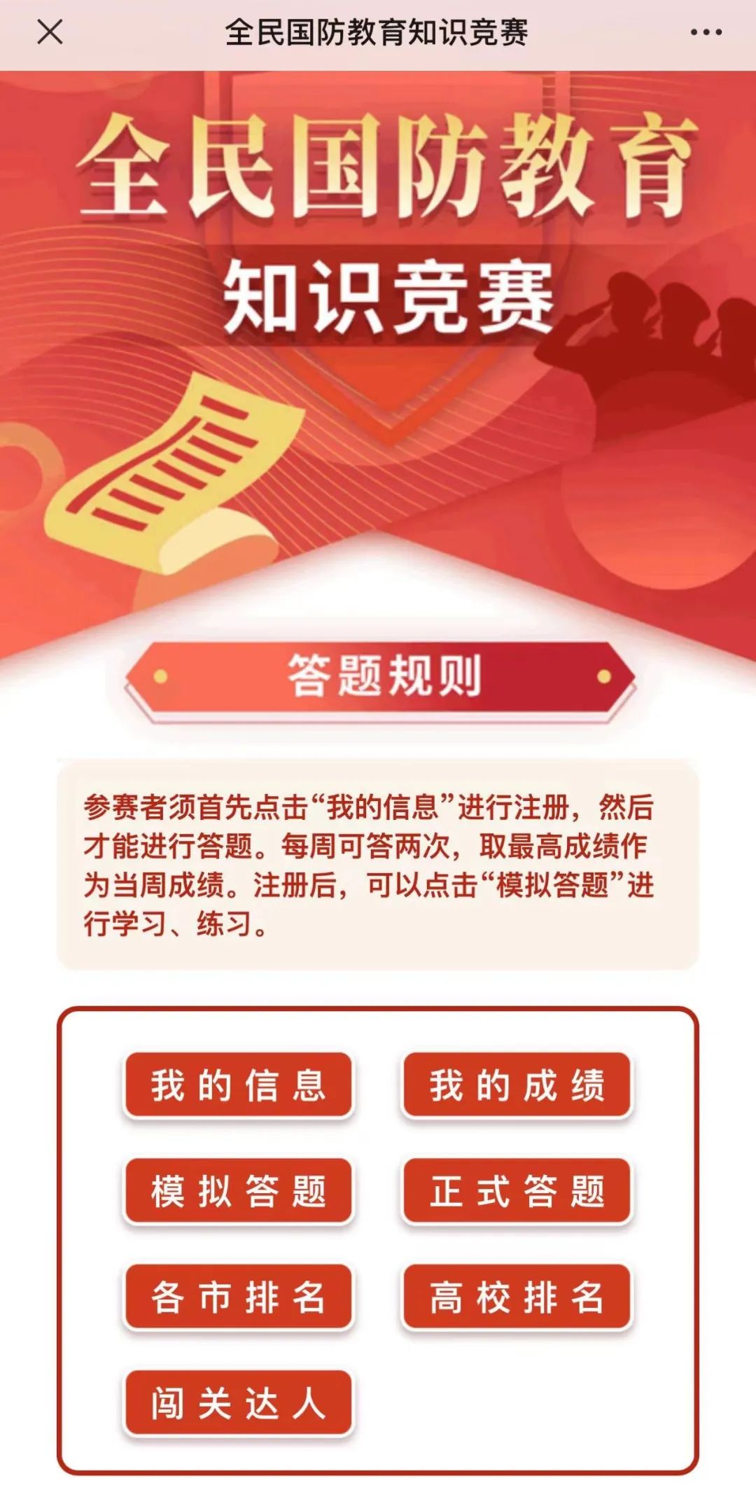 每人每周两次答题机会,取最高成绩作为当周成绩,可以点击“模拟答题”进行平时练习。