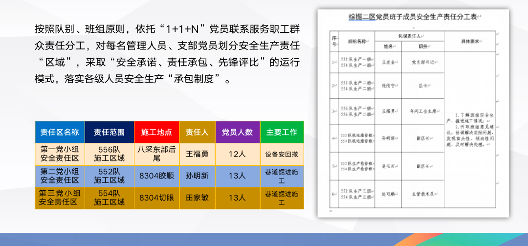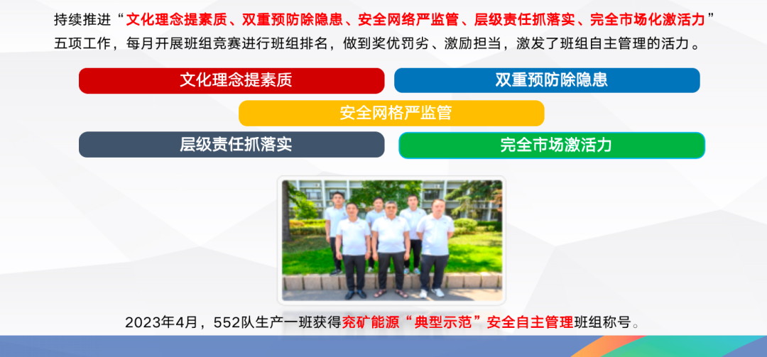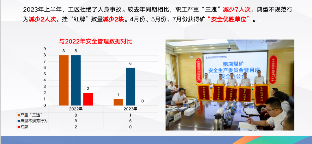 今年以来,综掘二区认真贯彻落实矿党政工作部署,围绕安全管理、掘进施工等重点工作,切实履行党政“同责”,抓好安全管理“首责”,压实掘进生产“主责”,截止到7月份完成掘进进尺3333米,区队各项工作得到稳定开展。针对不规范行为、安全意识薄弱的职工,开展“思想帮扶、安全培训、互保联保、自我反省”的“四关”帮助教育。各班党员、班组工长与班组出现的不规范行为职工签订包保帮扶协议书,通过座谈交流、家庭走访、现场监督等形式,帮助不规范职工的思想、行为得到尽快转变。2023年上半年,工区杜绝了人身事故。较去年同期相比,职工严重“三违”减少7人次、典型不规范行为减少2人次,挂“红牌”数量减少2块。4月份、5月份、7月份获得矿“安全优胜单位”。按照队别、班组原则,依托“1+1+N”党员联系服务职工群众责任分工,对每名管理人员、支部党员划分安全生产责任“区域”,采取“安全承诺、责任承包、先锋评比”的运行模式,落实各级人员安全生产“承包制度”。结合掘进任务,组织管理人员、工班长围绕进尺任务、关键系统、薄弱环节进行掘进“会诊”,超前制定施工措施,着力解决“看不到、想不到、查不透”等问题,做到抓安全“管理精细化,生产科学化、区域明确化,责任具体化”,全面做好安全生产“大包干”。1~7月份,完成掘进进尺3333米,节余材料费用86110元。进尺完成较去年同期相比增加243米、节约材料费用增16932元。特别是4月份以来,连续4个月完成进尺保持在500米以上,实现了高效节能生产。成立安全管理“自查”小组,实施查“思想作风、作用发挥、制度执行、不放心人、安全隐患治理”“五查”补漏工作法。确保工区安全管理的“可控、能控、在控”。持续推进“文化理念提素质、双重预防除隐患、安全网络严监管、层级责任抓落实、完全市场化激活力”五项工作,每月开展班组竞赛进行班组排名,做到奖优罚劣、激励担当,激发了班组自主管理的活力。2023年4月,552队生产一班获得兖矿能源“典型示范”安全自主管理班组称号。
