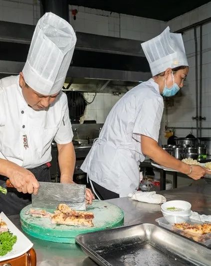 中式烹调师比赛现场,参赛选手需要在60分钟之内完成两道自选菜品。他们全身心投入到比赛中,熟练运用煎、炒、炸、蒸、煮等多种烹调技法,充分展现了刀工、火候掌控和盘艺创作技能,尽显大厨风范。