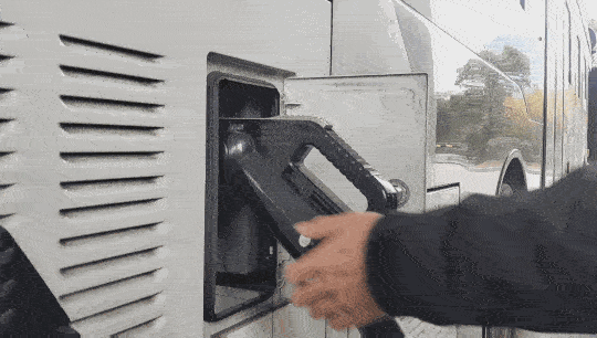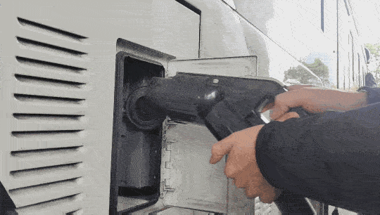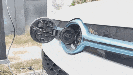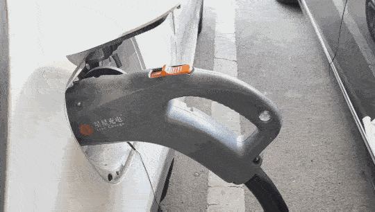 然后一只手握住充电枪把手,另外一只手拖住枪,将充电枪抬至微动开关(滑动开关)与地面平行;不要按压微动开关(滑动开关),插入车辆充电插座,同时会听到“咔哒”一声。