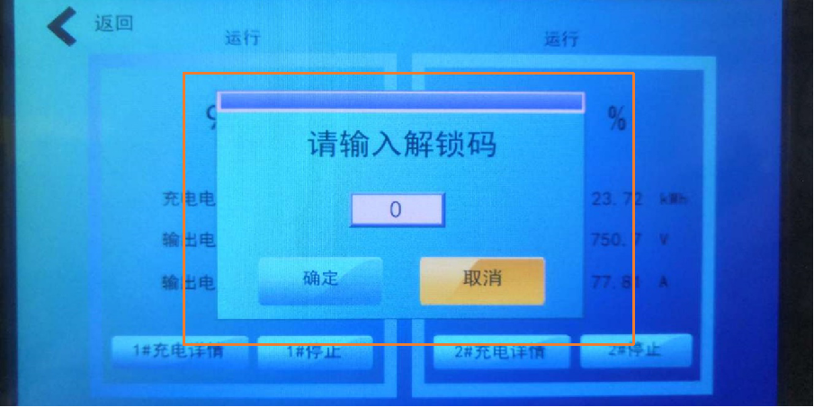此时在充电桩屏幕上选择相应的充电枪号,点击【充电详情】按钮,会跳出【请输入解锁码】窗口,将4位解锁码输入充电桩屏幕解锁码窗口,可停止充电,拔下充电枪(拔枪方式同上)。