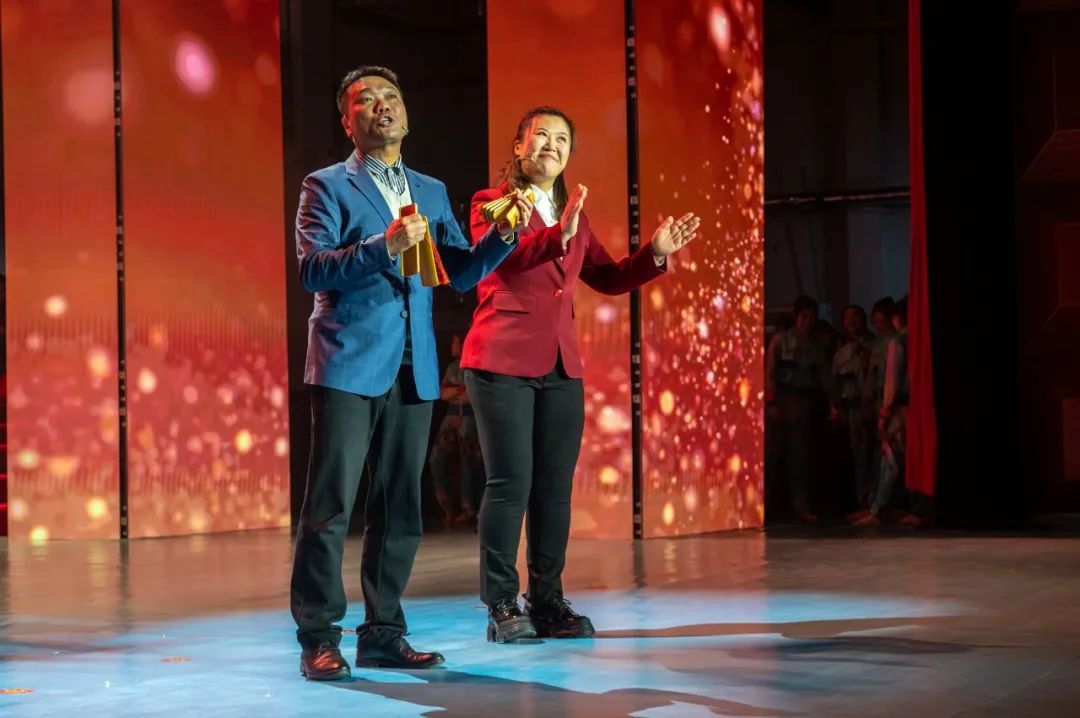 伴随着欢快的开场舞,典礼拉开序幕。“这一年,我们用‘党建引领’激扬力量,红色鲍店彰显底色;这一年,我们用‘使命担当’扛起责任,智慧鲍店彰显实力;这一年,我们用‘真情关爱’传递温暖,和美鲍店彰显担当……”随着激昂的音乐声,“红色鲍店”“智慧鲍店”“和美鲍店”三大篇章缓缓展现在观众眼前,带领大家共同回顾充实与幸福的2023年,每一帧镜头都彰显着全矿干部职工团结奋进的昂扬风貌,激励着大家以奋进姿态开启新征程。典礼现场,矿领导为鲍店煤矿2023年度六好区队(科室)、十大标兵、十佳区队(科)长、十佳安全班组、十佳工班长、优秀星级员工代表,群众性创新创效先进单位、个人和成果,十佳暖心志愿者颁发奖杯和证书。除了激动人心的颁奖环节,现场还有精心编排的歌舞《都说咱们工人有力量》《竹石》《爱让梦想来》、情景剧《亮剑精神》、相声《我要创新》《科目三》、诗朗诵《掌声响起来》等丰富多彩的文艺节目,向广大干部职工呈现了一场视听盛宴。表演者们用精湛的演技、充沛的感情以不同方式深情诉说了这一年的辛苦与收获,致敬始终拼搏奋斗、默默奉献、敬业担当的干部职工,现场观众赞不绝口,还时不时拿出手机记录下精彩瞬间,现场精彩纷呈,气氛高潮迭起。