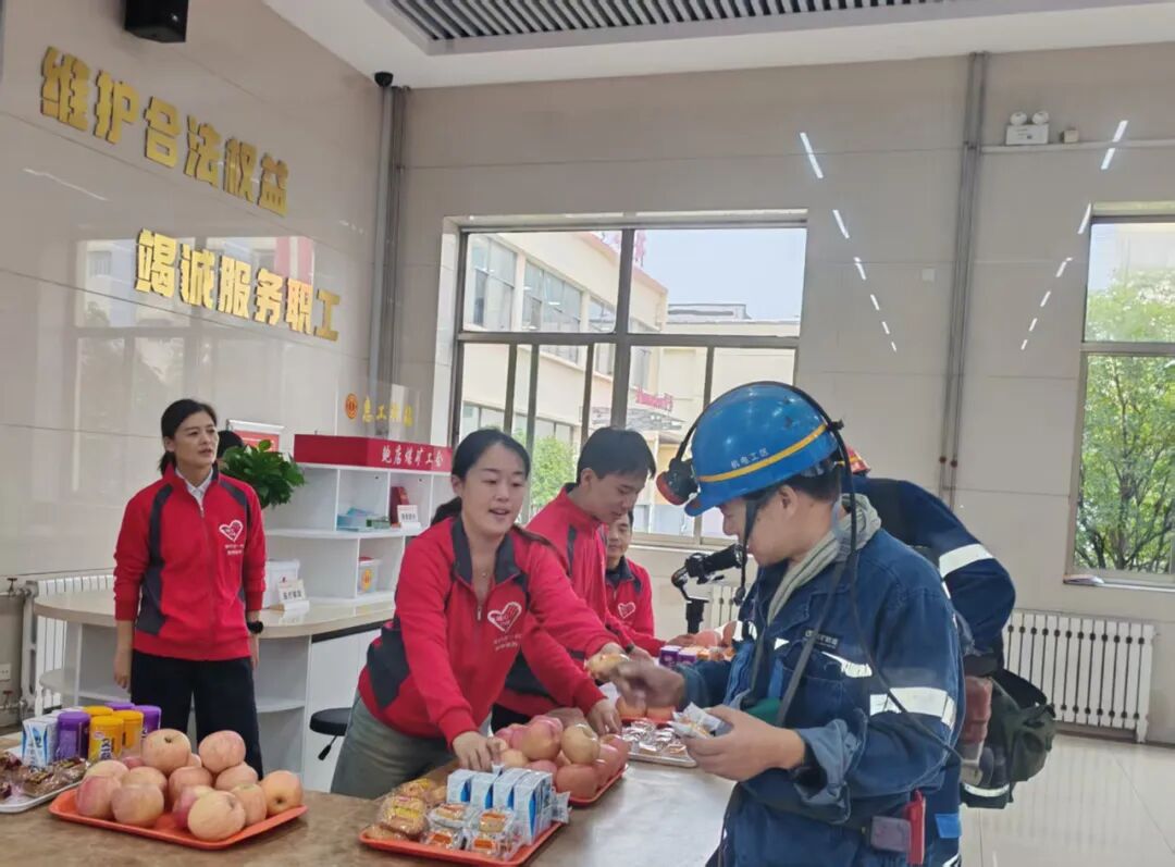 驿站内,安全宣传图册、常用药品、血压计、糖果、雨衣雨伞等物资分类摆放,方便职工随取随用。节日期间,工会工作人员更是提前到位,将象征团圆的月饼、寓意平安的苹果、以及方便携带的八宝粥、牛奶等食品一一递到刚升井的矿工手中。每一份慰问品都承载着企业对职工的牵挂,每一句安全叮嘱都饱含着对矿工平安归来的期盼。