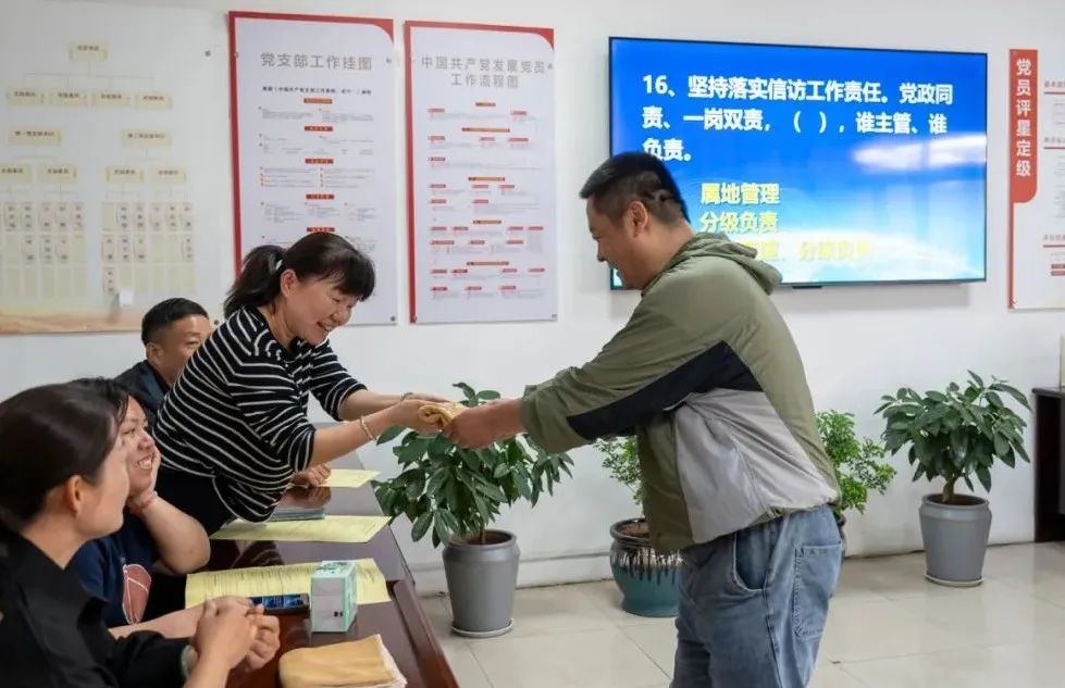 同时,该矿组织工作人员进区队、进班组,开展信访工作知识有奖竞答。活动现场,大家热情高涨,对答如流,信心满满。工作人员为答对问题的职工现场发放洗发水、毛巾等奖品,遇到生疏的知识点,工作人员耐心进行讲解。活动轻松欢快、寓教于乐,深受职工认可。