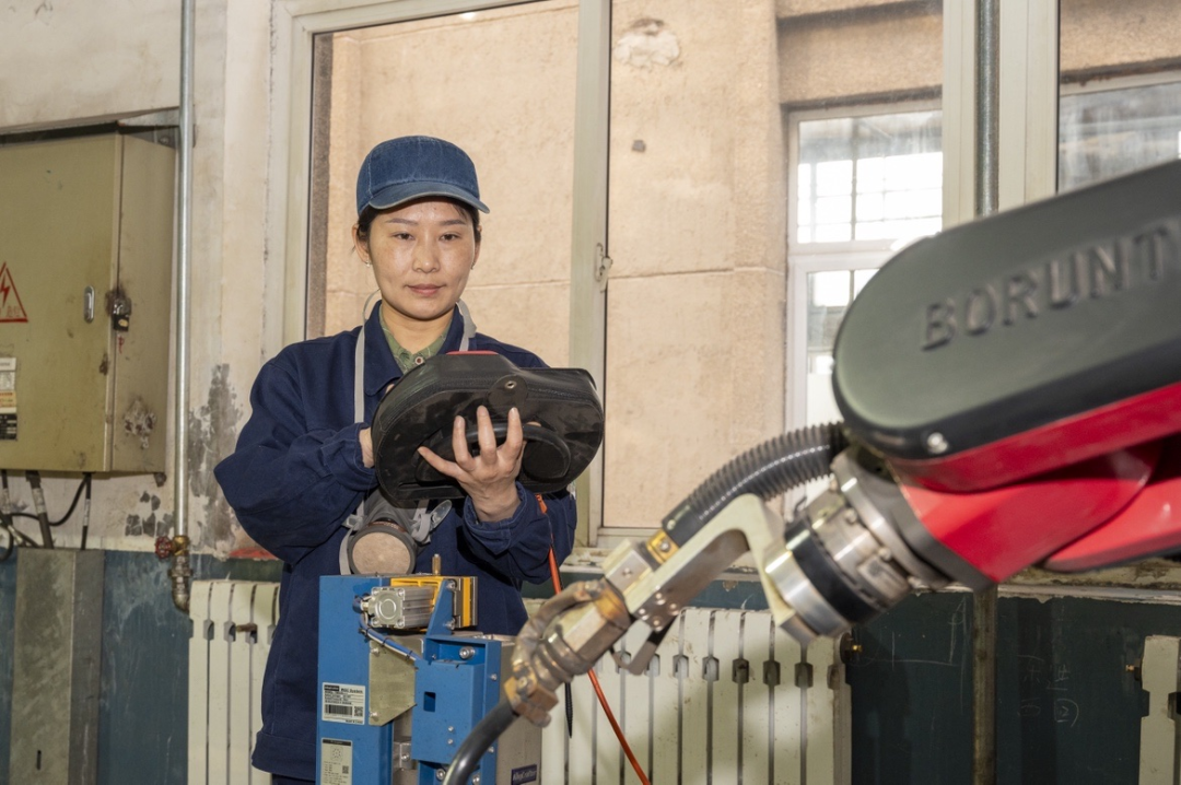 散会后,同事们纷纷换上工作服走进车间。她果然在这个队伍里,在厚厚旧旧的工作服的包裹下,她是有些贴近刻板印象里的焊工形象了。然而,她娇小柔弱的身形依旧让我难以相信她真的可以做得来这份苦差事。