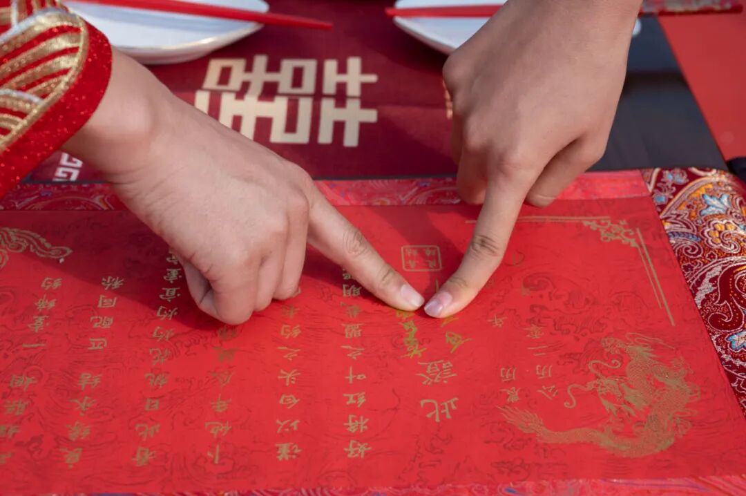 红绸金边的婚书上,新人共同提笔签下名字,“一纸婚书,两心相契,三餐四季,四世不离”,笔墨间满是对未来的期许。