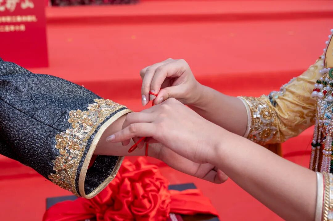 新娘取新郎发间红线,在其腕间系结,“红绳结发,无分彼此”,象征从此岁岁相守、不离不弃。