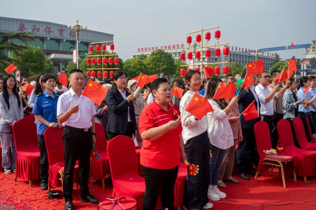 鲜红的国旗在风中飘扬,10对新人与现场所有来宾共同起立,挥动手中的国旗,齐声唱响《歌唱祖国》。“五星红旗迎风飘扬,胜利歌声多么响亮……” 激昂的旋律回荡在矿山上空,新人脸上的幸福与对祖国的热爱交相辉映。