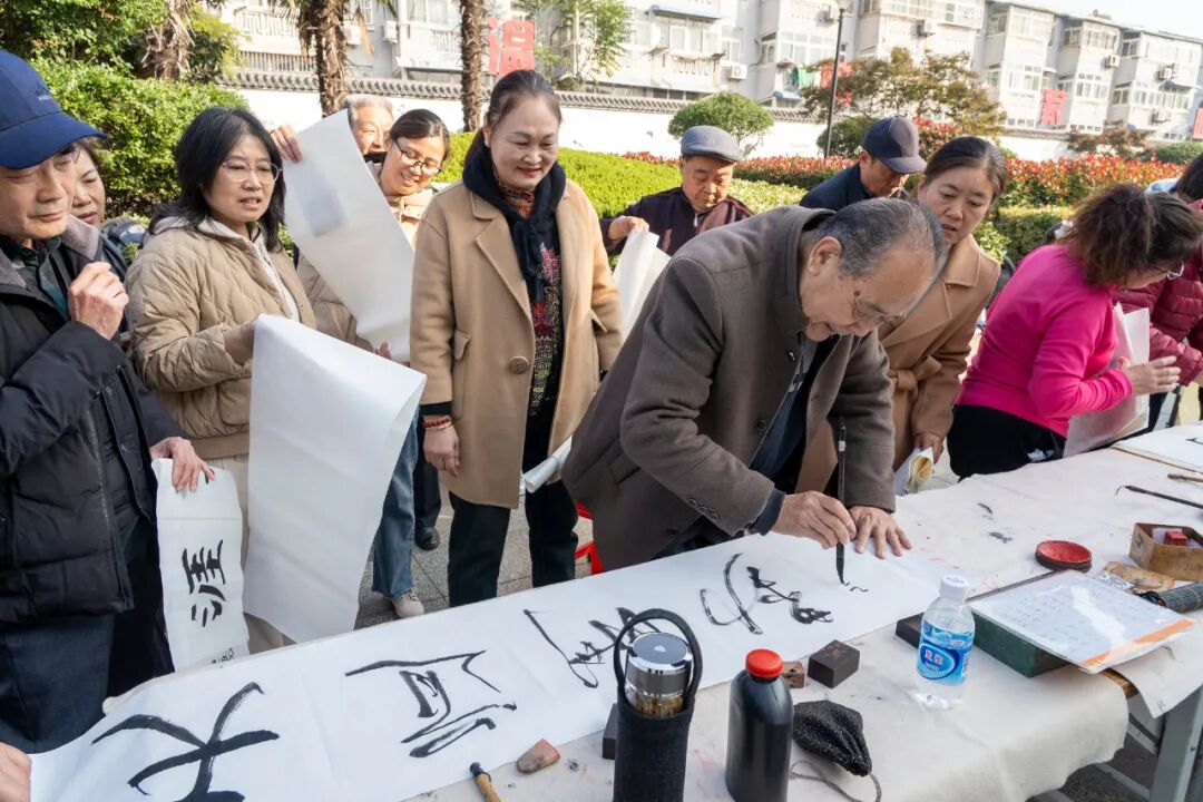 那边忙碌有序,这边歌舞纷呈。腰鼓《中华全家福》鼓声震天,10余名身着红衣的老人以铿锵的节奏敲响新时代的赞歌;舞蹈《五星红旗》中,演员们手持彩扇翩翩起舞,如彩蝶纷飞,舞出对祖国最深情的告白;电吹管合奏《祝福祖国》旋律悠扬,京剧《太真外传》选段字正腔圆。老人们看得津津有味,赞不绝口,脸上洋溢着幸福的笑容。此外,书法展示区墨香四溢,矿区书法爱好者现场挥毫泼墨,写下“福如东海”“寿比南山”等祝福······