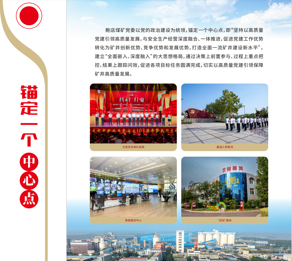 鲍店煤矿党委秉承“党建工作就是有形的生产力”理念,以山东能源集团“双入双创”党建工作模式和兖矿能源“兖矿新时代—‘融·创’”党建品牌为引领,以现代管理理念为指导、以信息技术为支撑、以制度建设为基础、以提升党建质量为目标,创新构建了“3.1415”党建现代化管理体系,为打造全面一流矿井建设高水平注入强劲红色动能。即日起,微信订阅号开设“党建现代化管理体系”专栏,分期解读党建现代化化管理体系相关内容,本期刊发的是“一个中心点”。