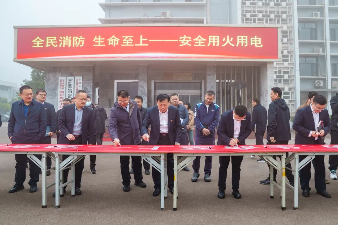 在办公楼前工广区,矿长靳绍波、党委书记赵计华带领在家领导班子成员、专业副总师及各单位主要负责人,在“全民消防 生命至上 —— 安全用火用电” 主题条幅上签名承诺。现场还设置了黑板报展示、消防知识讲解、消防器材演示等环节,让参与人员直观学习消防技能。