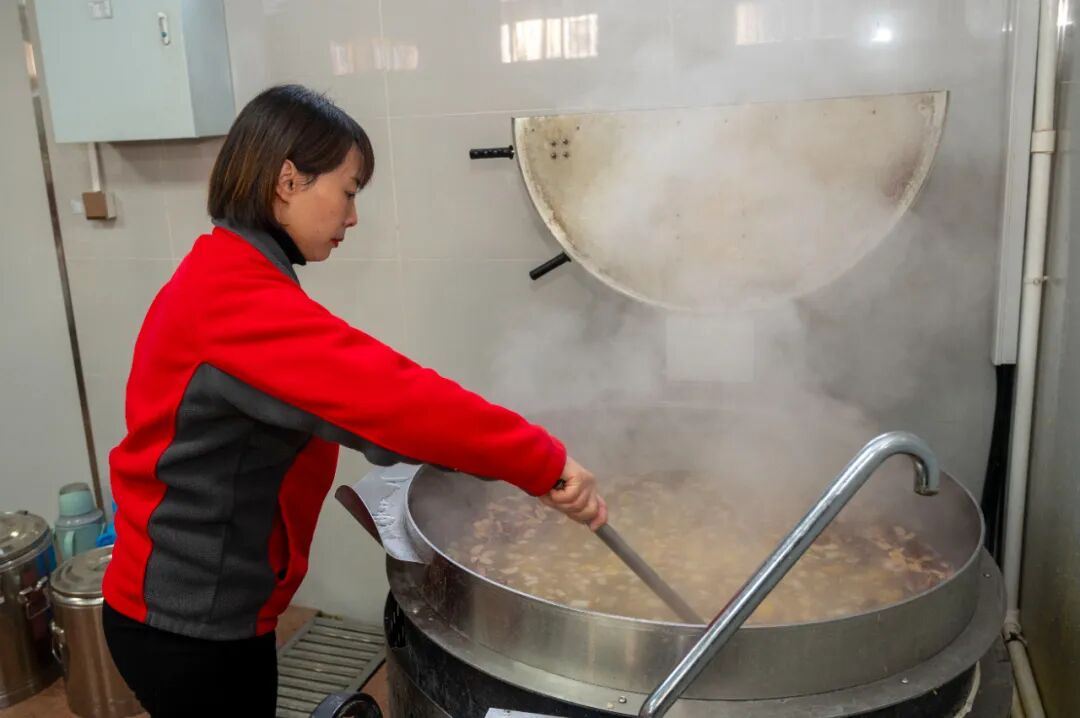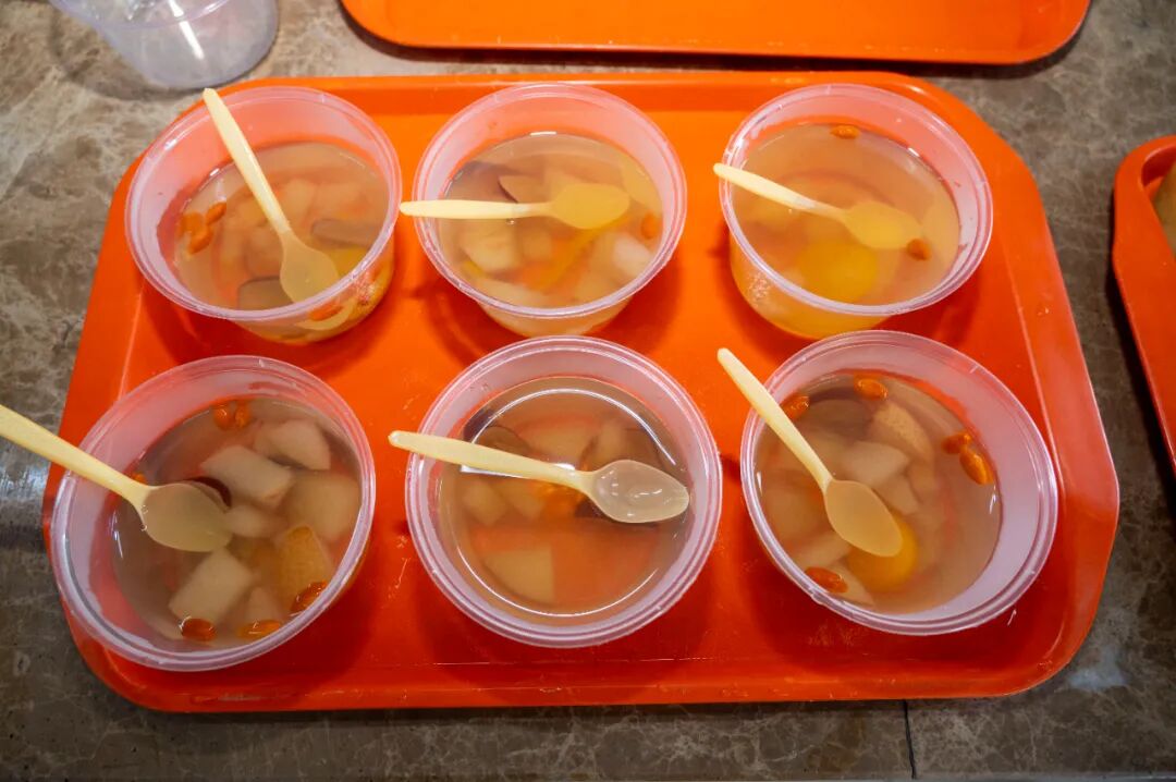 半个小时大火煮沸,又加入枸杞和冰糖续煮。经过近一个小时的精心熬制,色泽鲜亮、热气腾腾的金桔雪梨汤终于出锅,女工协管员将汤盛进保温桶,送往各个工作岗位。