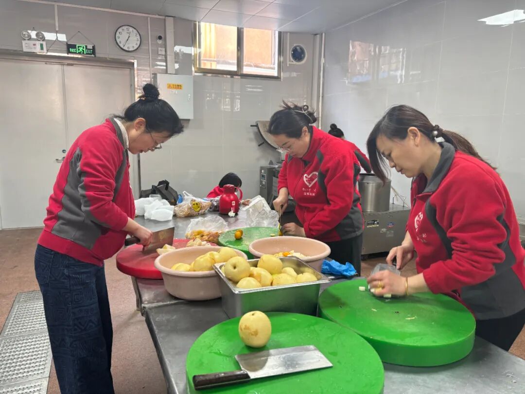 中午时分,在该矿井口餐厅后厨,放弃午休的女工协管员们围在操作台前,分工有序地忙碌起来。她们将金桔搓洗去蜡、雪梨切成小块、红枣逐个去核……