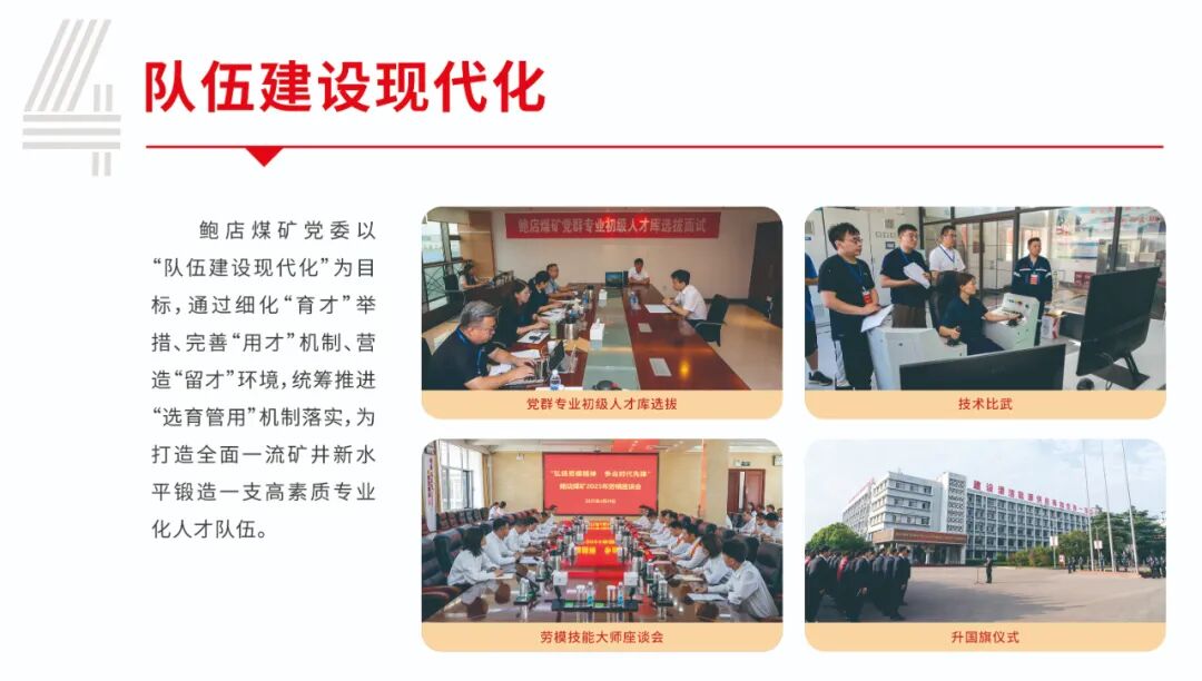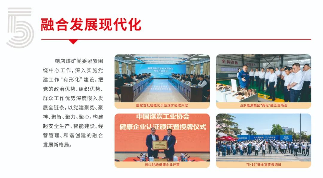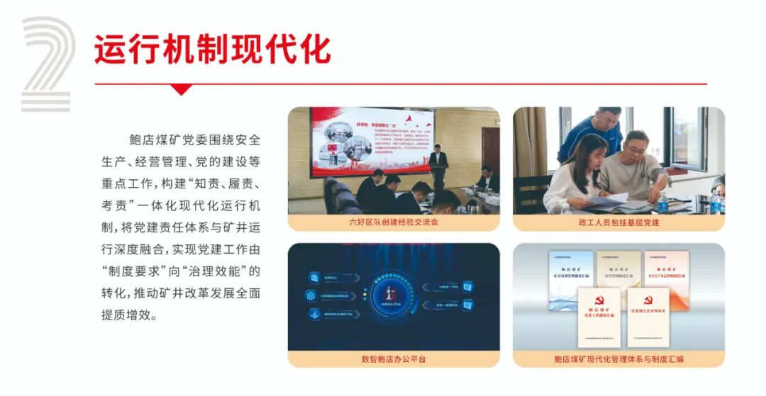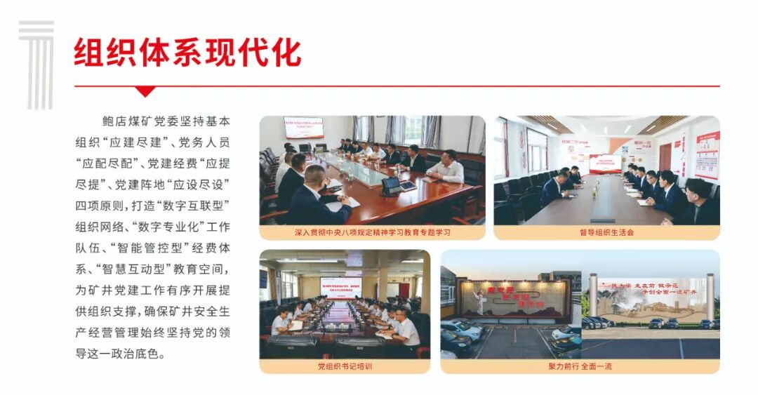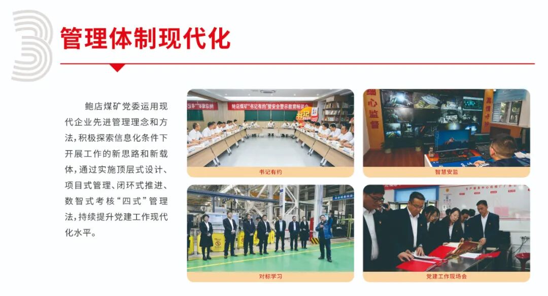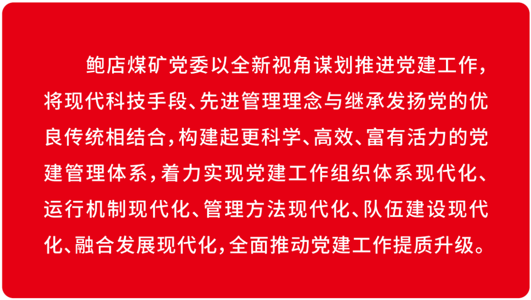 鲍店煤矿党委秉承“党建工作就是有形的生产力”理念,以山东能源集团“双入双创”党建工作模式和兖矿能源“兖矿新时代—‘融·创’”党建品牌为引领,以现代管理理念为指导、以信息技术为支撑、以制度建设为基础、以提升党建质量为目标,创新构建了“3.1415”党建现代化管理体系,为打造全面一流矿井建设高水平注入强劲红色动能。即日起,微信订阅号开设“党建现代化管理体系”专栏,分期解读党建现代化化管理体系相关内容,本期刊发的是实现“五个现代化”。