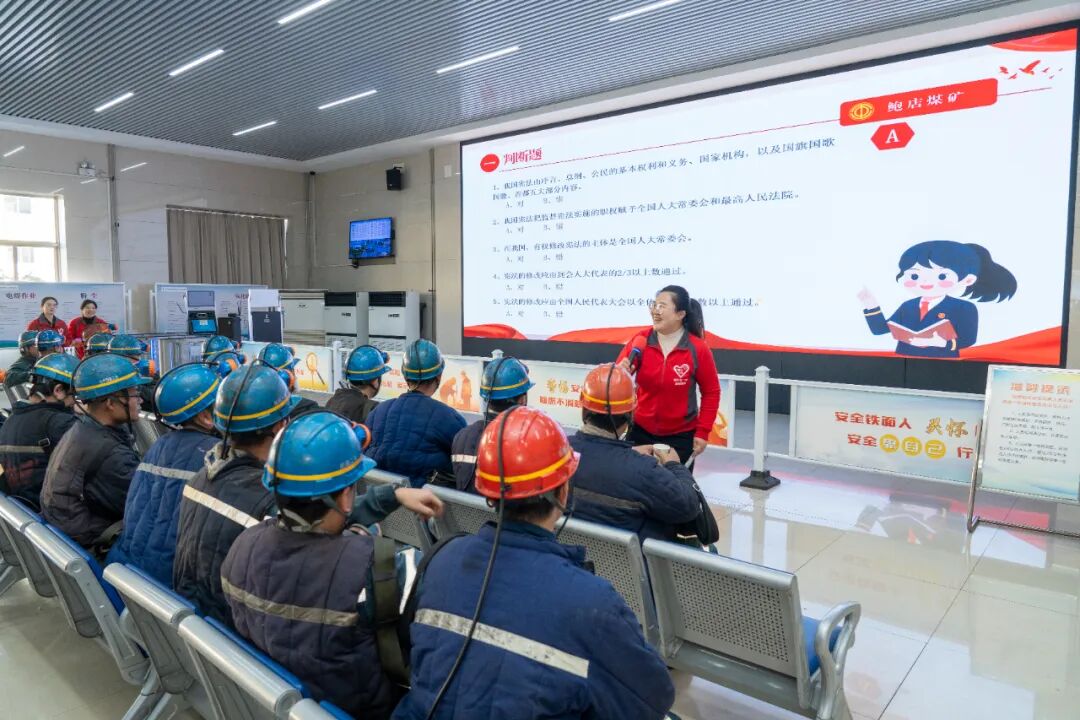 这是12月3日中午,在该矿井口候罐大厅举办“普法惠工守底线 聚力同心护安全”主题活动时的场景。活动将宪法宣传与健康关爱、文化赋能、暖心服务相结合,把党政工的关怀精准送到职工身边,为全年安全生产凝聚法治合力。