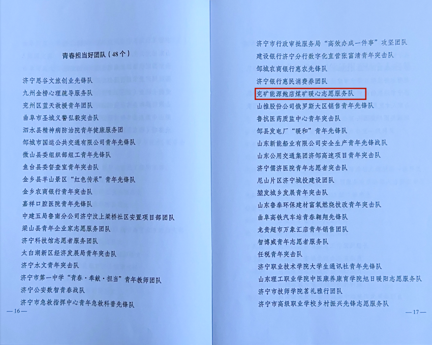 鲍店煤矿暖心志愿服务团队被共青团济宁市委授予“青春担当好团队”称号。
