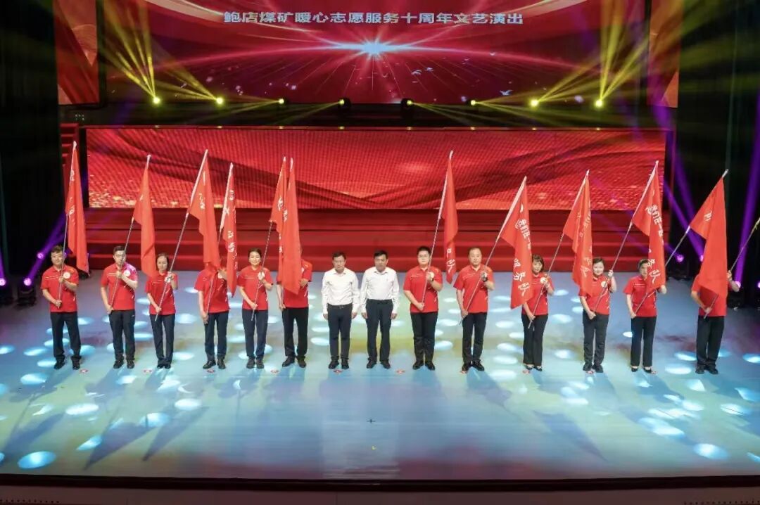 暖心志愿服务十周年,矿领导为十二个志愿服务队授旗。
