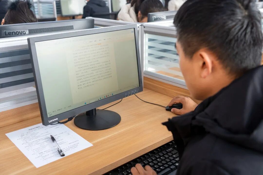 比武现场,键盘敲击声此起彼伏,监考人员严格监考,整个考场秩序井然、严肃认真。