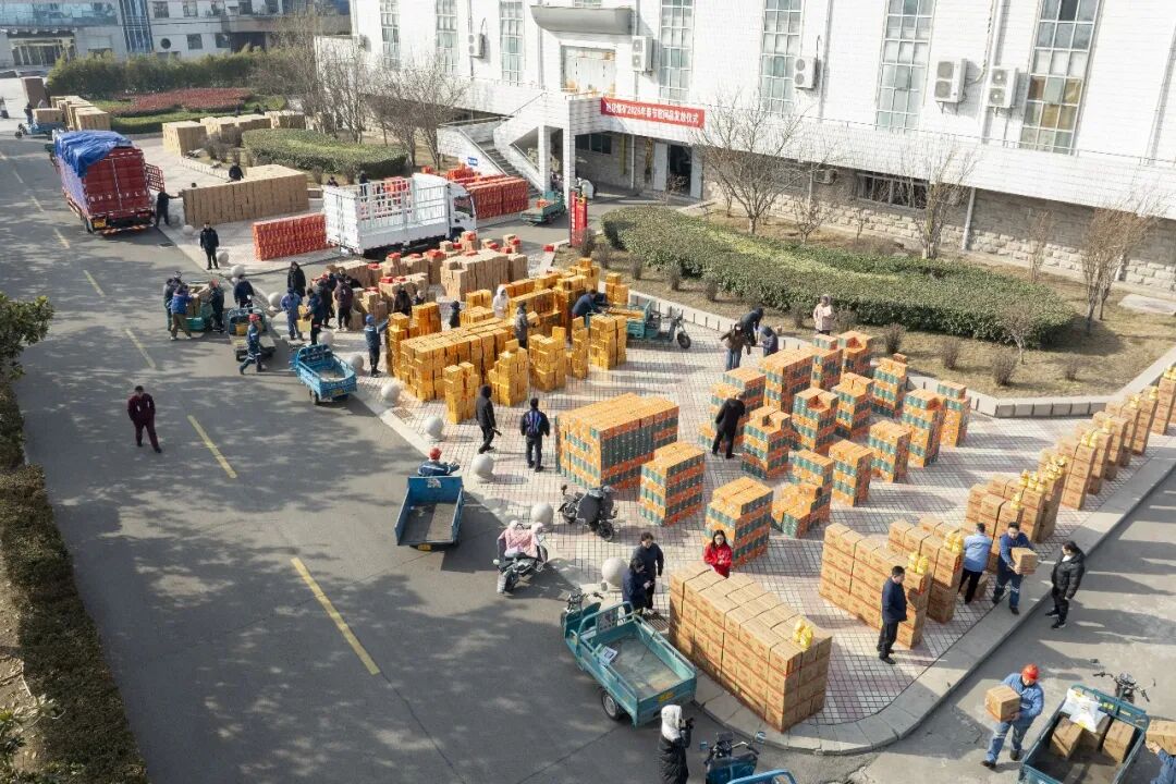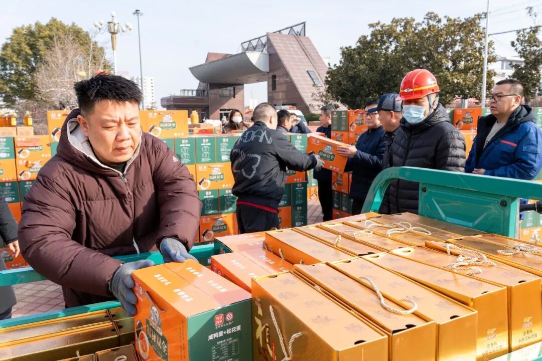 福利发放现场车来车往、人头攒动。大家你传我搬,或手提肩扛,叉车、三轮车等各显神通,装满了码放整整齐齐的祝福礼,职工们脸上洋溢着朴实而满足的笑容。